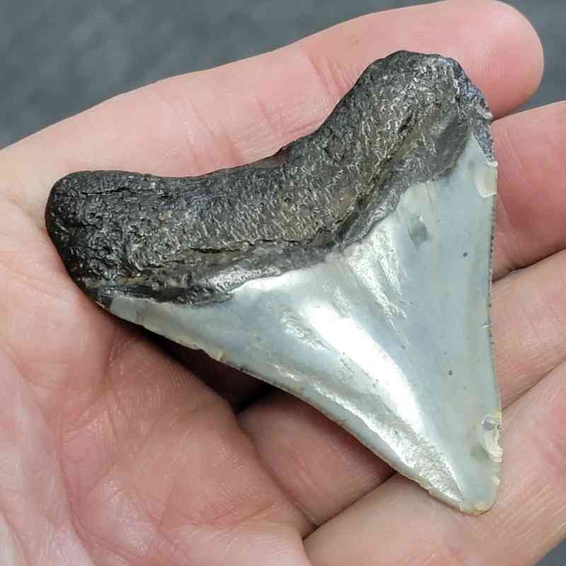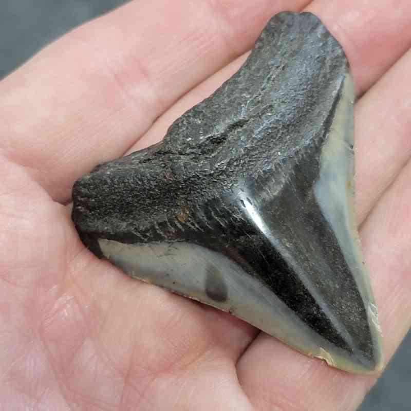 2 1/2″ – Polished 90% Complete Megalodon Shark Tooth with Dark Brown Root with Brown/Gray Enamel
