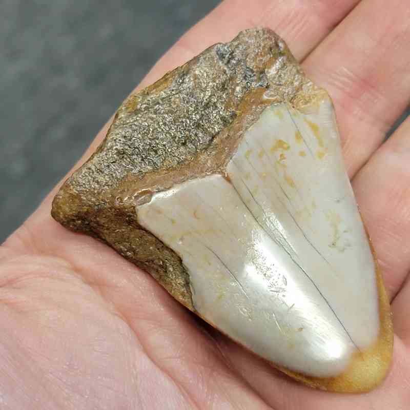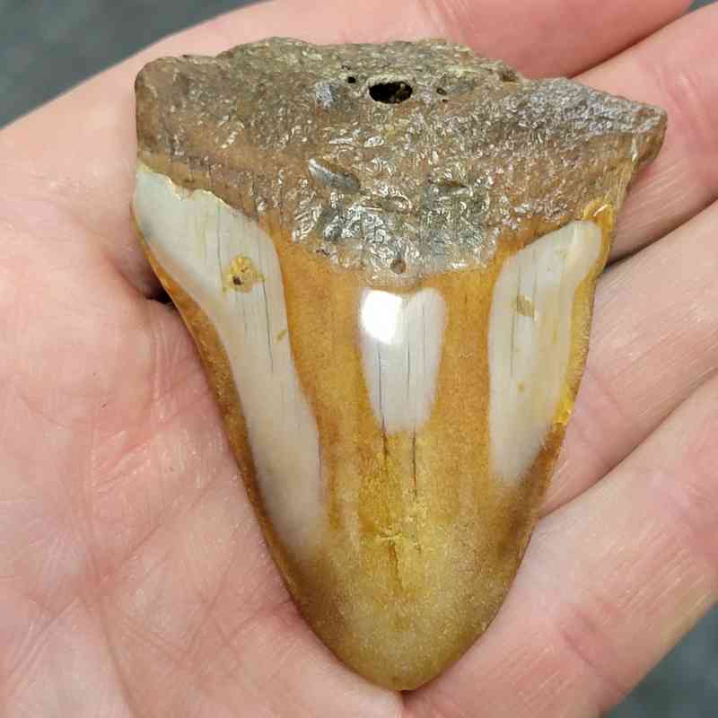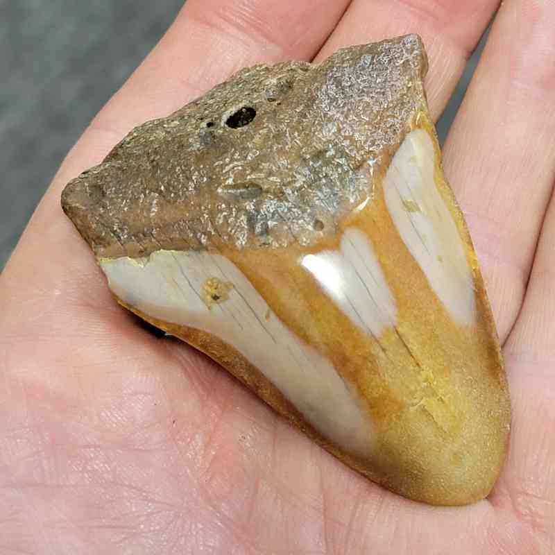 2 1/2″ – Polished 90% Complete Megalodon Shark Tooth with Brown Root with Tan Enamel