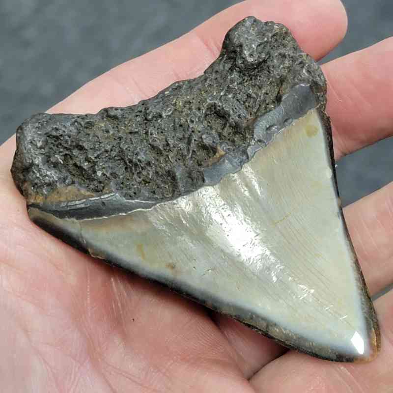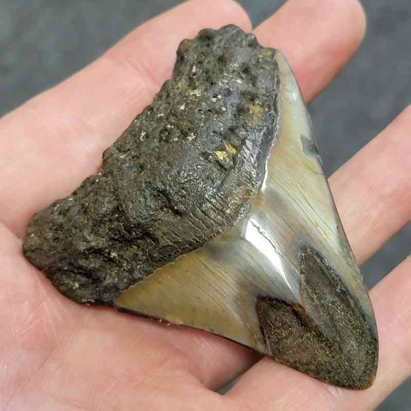 3″ – Polished 90% Complete Megalodon Shark Tooth with Dark Brown Root with Gray/Brown Enamel
