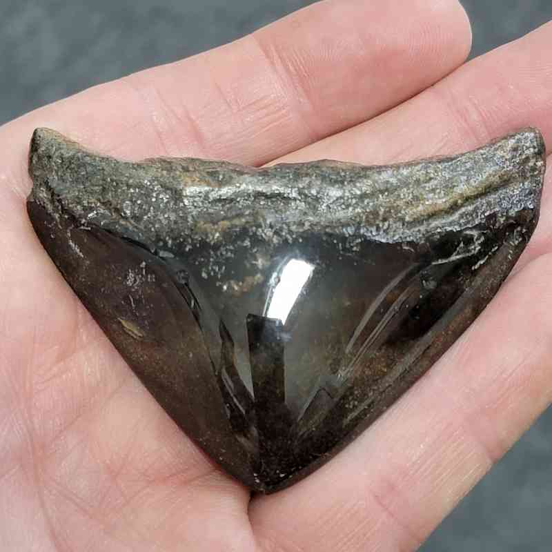 2 1/2″ – Polished 90% Complete Megalodon Shark Tooth with Dark Brown Root with Dark Brown Enamel – Managers Choice!