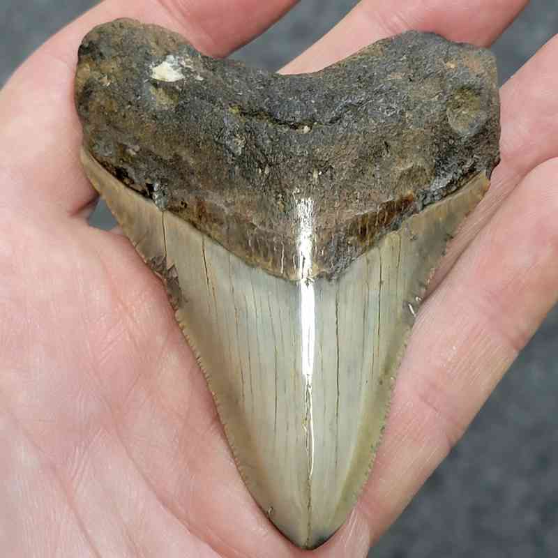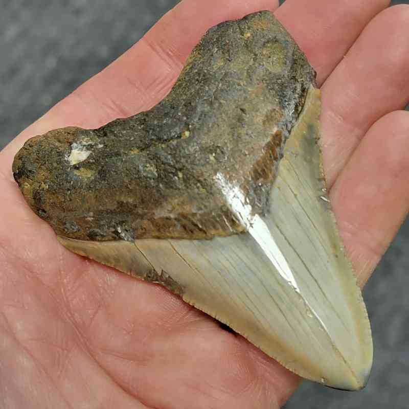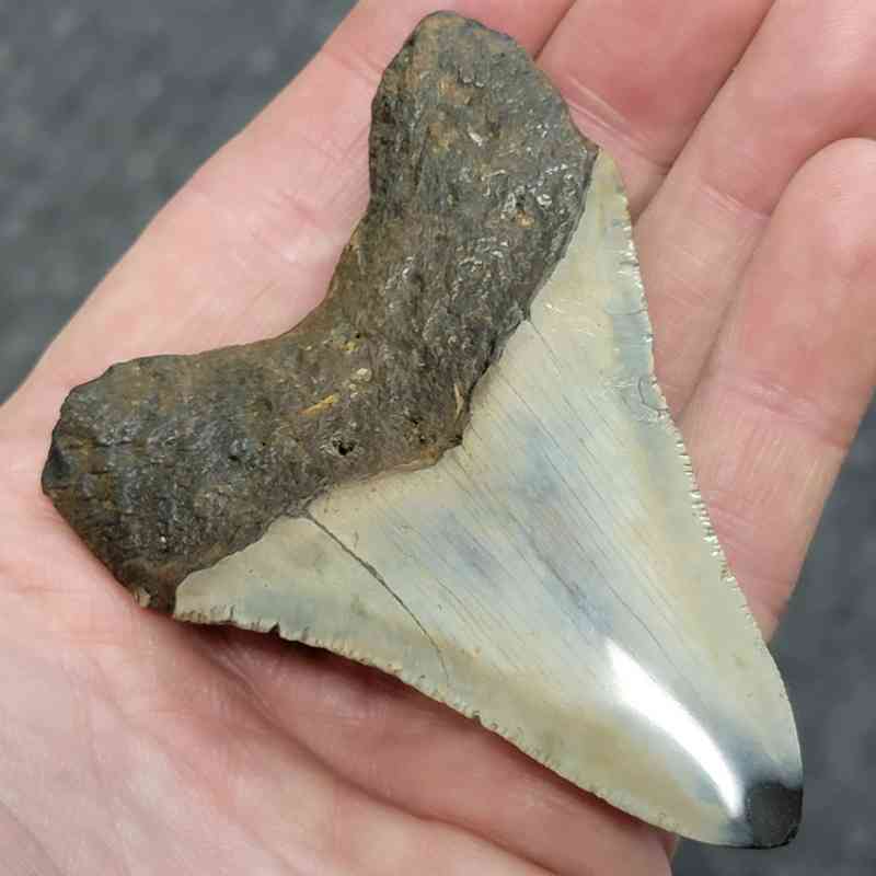 3 1/2″ – Polished 90% Complete Megalodon Shark Tooth with Brown Root with Gray Enamel – Very Pretty Tooth!