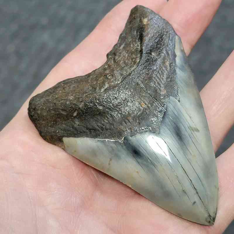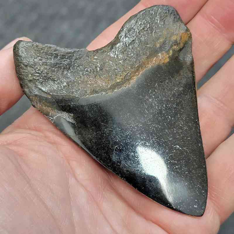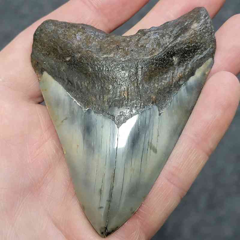 3 1/2″ – Polished 90% Complete Megalodon Shark Tooth with Dark Brown Root with Light Gray/Charcoal Enamel – Distinctive!