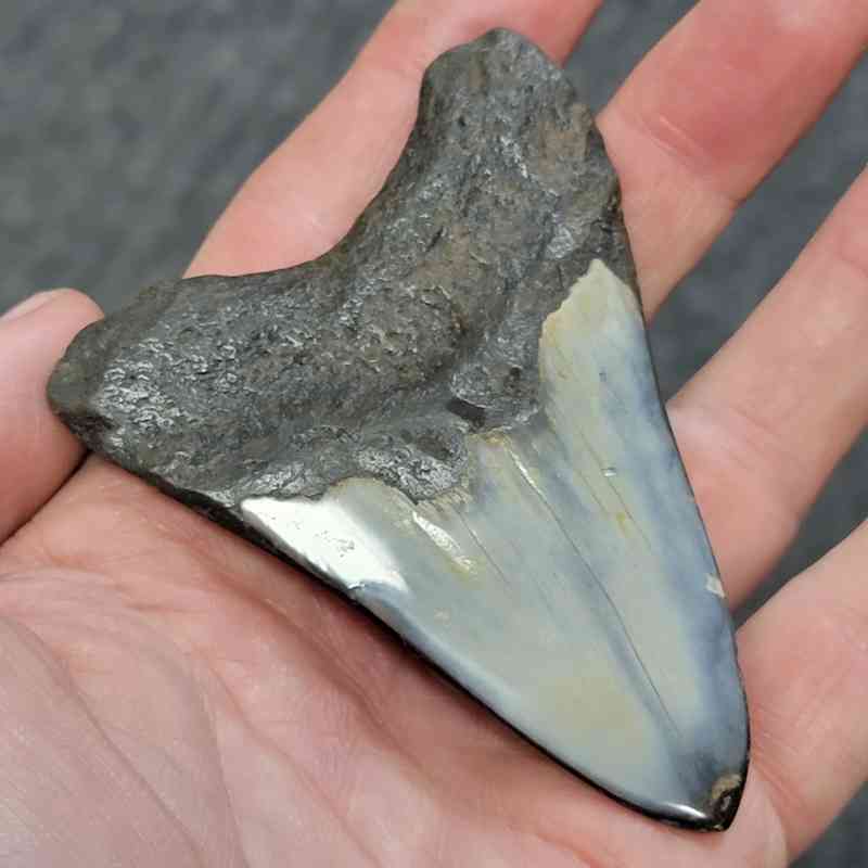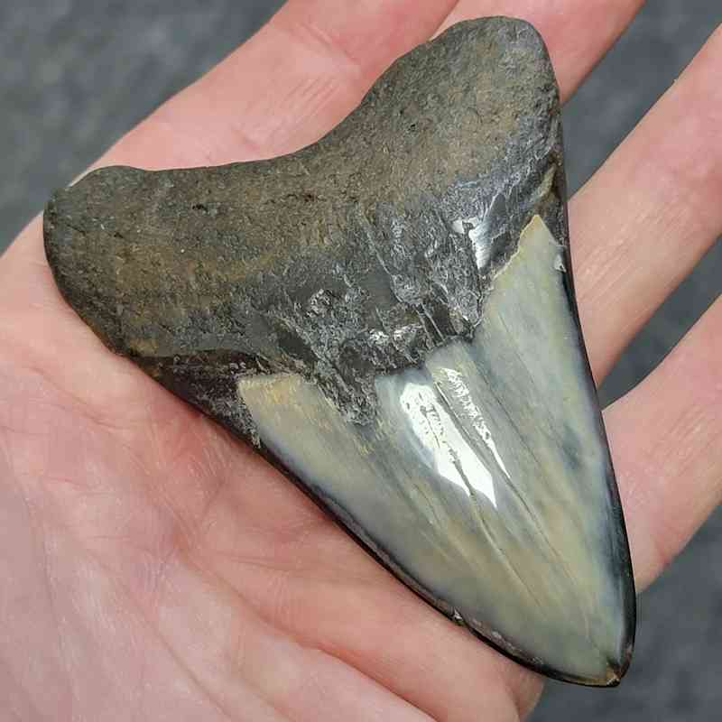 3 1/2″ – Polished 90% Complete Megalodon Shark Tooth with Dark Brown Root whith Gray/Tan Enamel