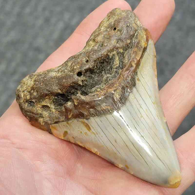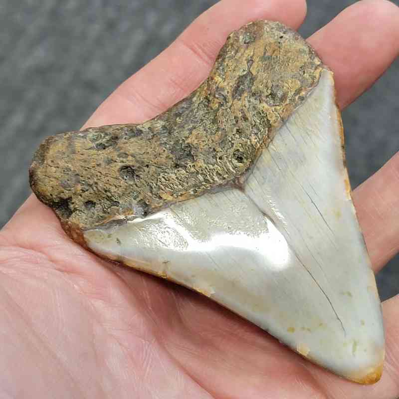 3 1/2″ – Polished 90% Complete Megalodon Shark Tooth with Mottled Brown Root with Gray Enamel – Good Looking Tooth!