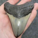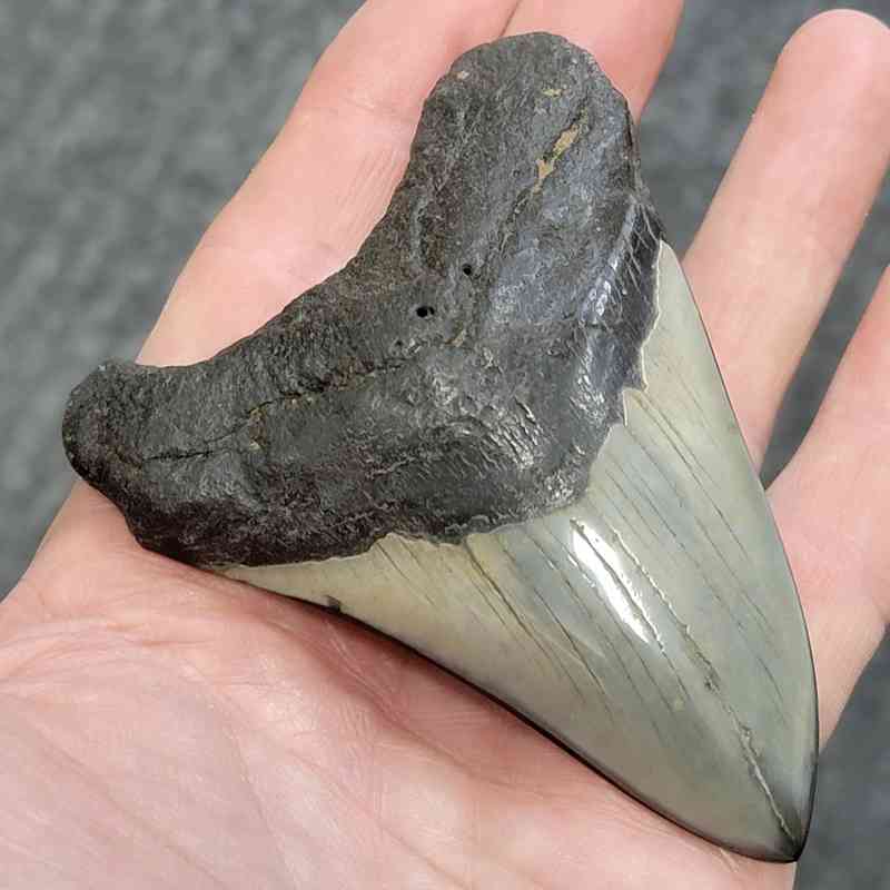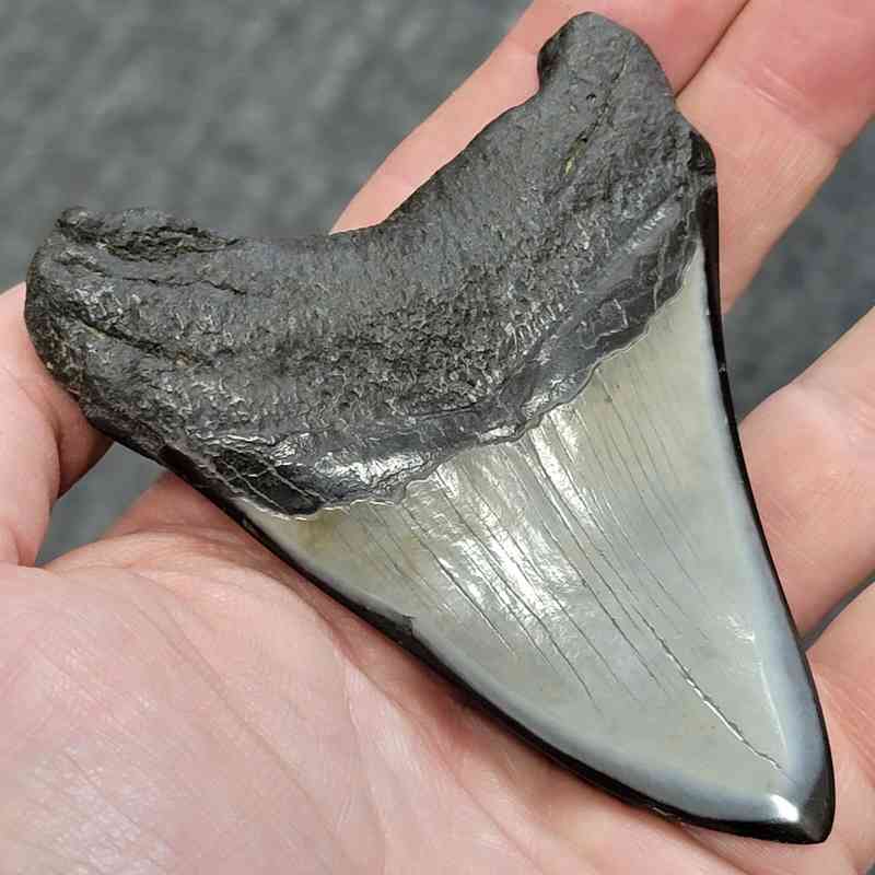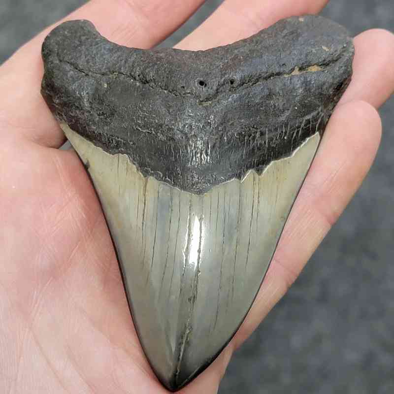 3 7/8″ – Polished 90% Complete Megalodon Shark Tooth with Dark Brown Root with Gray Enamel